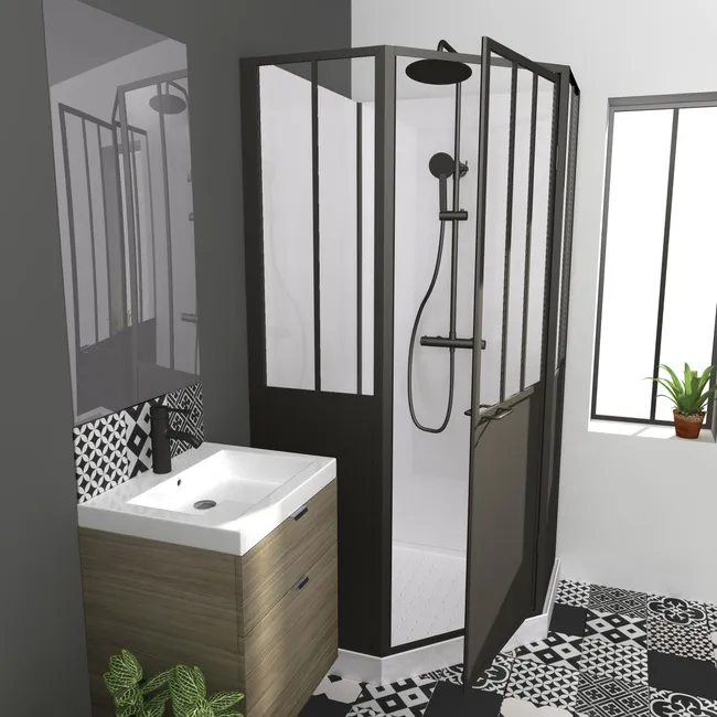 Cabine de douche ARTELO à l’esprit industriel. Les projections d’eau sont limitées grâce à une hauteur de 220 cm et le nettoyage facilité par son traitement anticalcaire. Son design et son ouverture de face permettent de positionner un meuble sur le côté pour un réel gain de place. La fixation de la cabine au mur est obligatoire pour une stabilité maximale. Existe en 3 dimension.