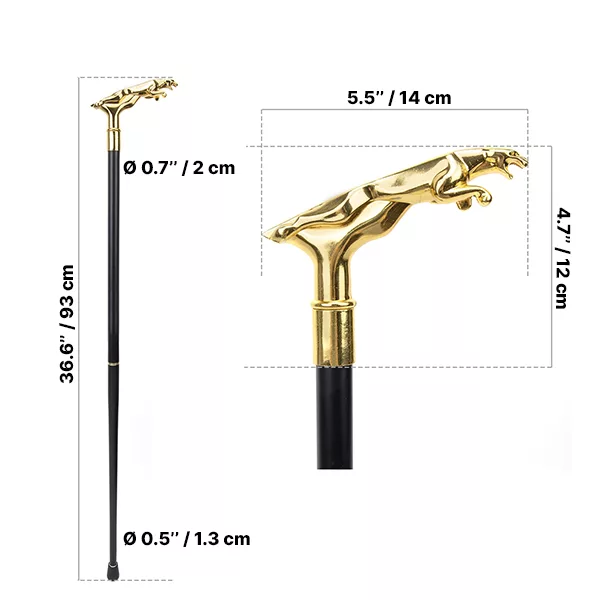 La poignée dorée en forme de léopard attaquant ajoute une touche distinctive à la canne et attire l’attention. Combinez notre canne avec des vêtements formels pour une apparence encore plus audacieuse.